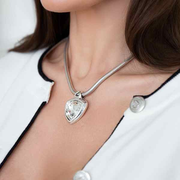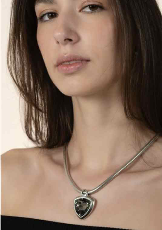 Mit dieser versilberten Schlangenkette ziehen Sie alle Blicke auf sich. Sie besticht durch ihre fließende und elegante Form, während der facettierte Kristall Anhänger, als zentrales Motiv für einen Hauch von Raffinesse und Glamour sorgt. Diese Halskette, die mit Stolz in Spanien von Ciclón entworfen und gefertigt wurde, verkörpert spanische Handwerkskunst und Stil.