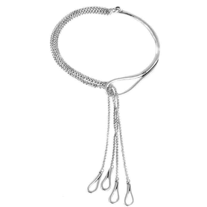 Gebogener Silberhalsreif mit feinen, lang hängenden Anhänger Ketten. Halskette aus versilberten Metal hergestellt von der spanischen Schmuckmanufaktur b&g