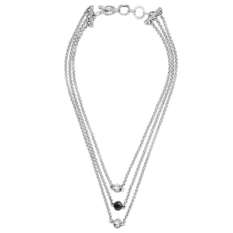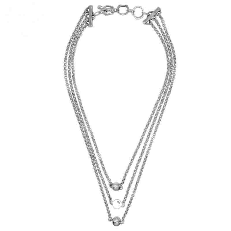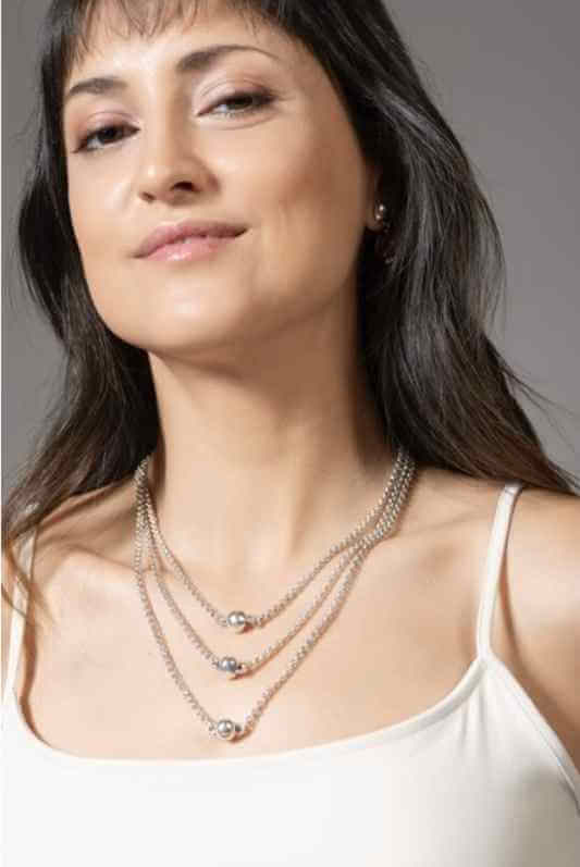 Atemberaubende 3-lagige versilberte Halskette, entworfen von Ciclon in Spanien. Jede der drei Ketten ist mit einer funkelnden Kristallkugel geschmückt und verleiht einen edlen und modischen Look. Dieses zeitlose, elegante Schmuckstück bringt Persönlichkeit in jedes Outfit. Hochwertige Verarbeitung aus versilbertem Metall.