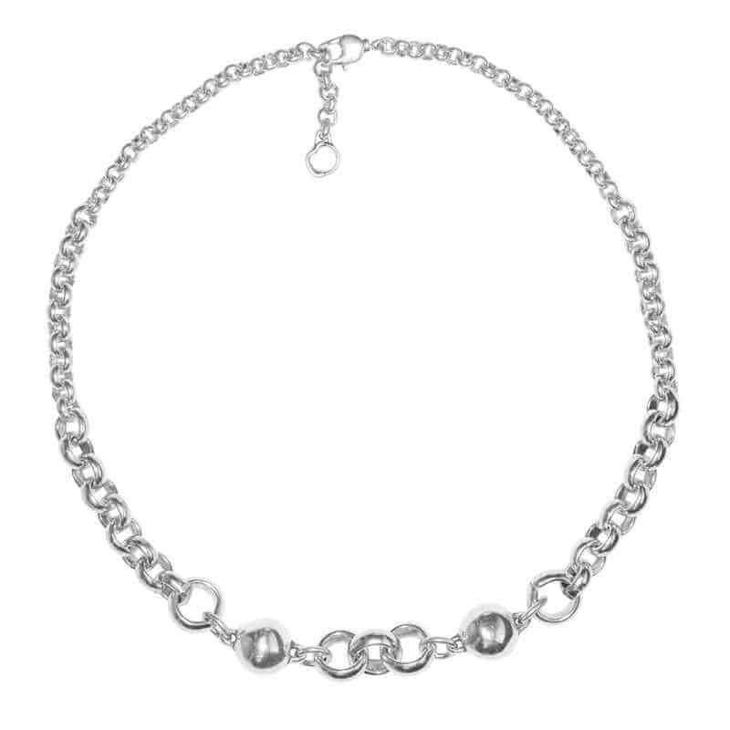 Erweitern Sie Ihre Schmucksammlung mit dieser mittellangen, versilberten Rolo-Kette. Sie besteht aus einer Anzahl von runden Gliedern und ist mit zwei strahlenden Silberperlen verziert. Ein zeitloses und vielseitiges Accessoire, das sowohl zu eleganter Abendgarderobe als auch zu lässigen Outfits passt. Dieses einzigartige spanische Schmuckstück wurde in Spanien von Ciclon entworfen und verkörpert außergewöhnliche Handwerkskunst und eine authentische Ausstrahlung.
