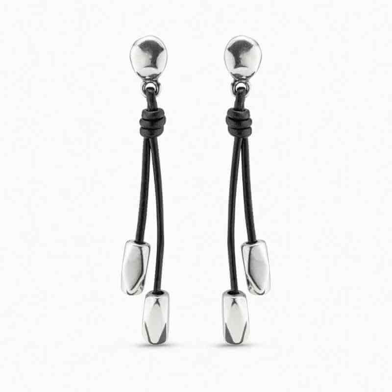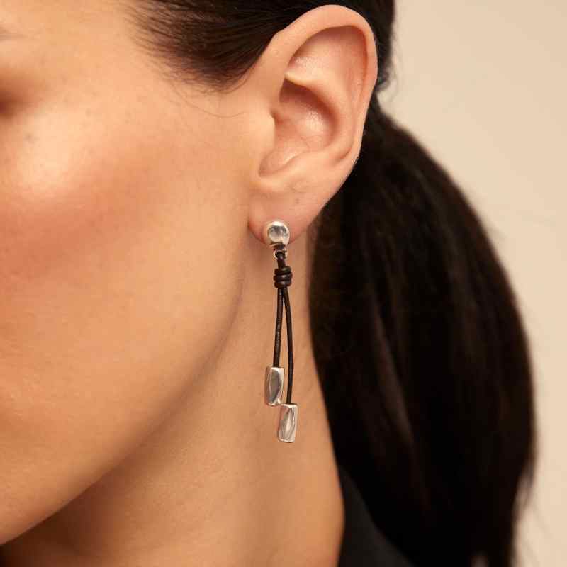 Long leather earrings crafted in silver-plated metal, in combination with two dangling brown leather cords which carry a diamond-shaped endings. Whether you want to treat yourself or surprise someone special, these earrings are a great choice for a unique and stylish gift. Silver-plated metal earrings with a push back closure made by UNOde50